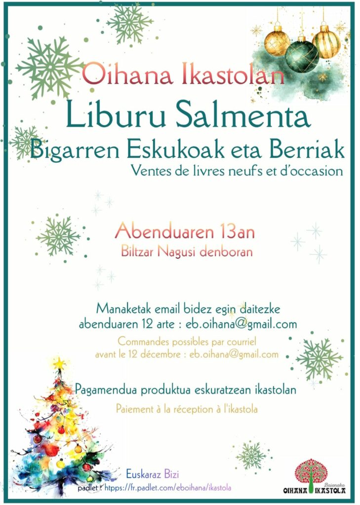 Urtero bezala, abenduko Biltzar Nagusiaren ondoren liburu eta diska azokatxo bat prestatu dute Euskaraz Biziko taldekoek ikastolan. Eguberriko opariak egiteko parada ezin hobea.
